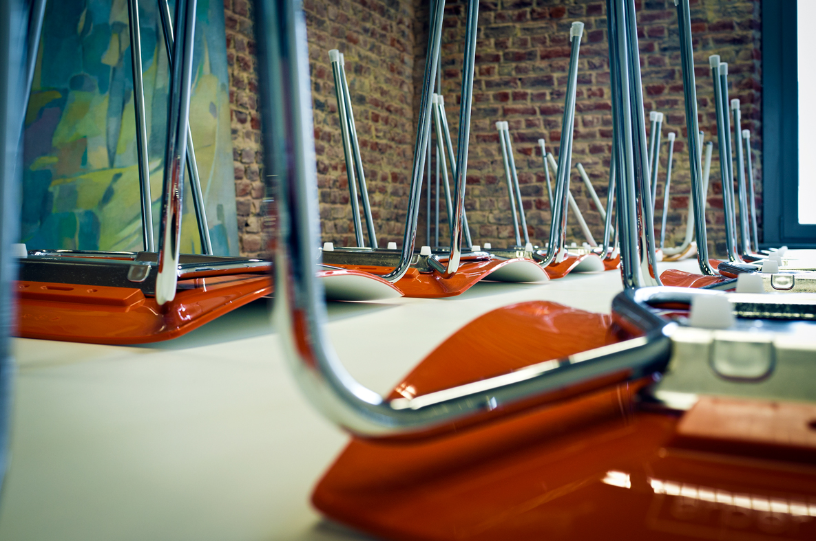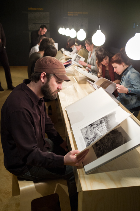 Curatoren Veys en Vandermeulen weten wat rust kan teweegbrengen. Als onderwerp én als lijdend voorwerp. Een tafel, een stoeltjesrij, Ikea-gloeilampen en boeken in spreidstand. Ik geniet van de tussenruimte die beide heren gecreëerd hebben. In mij roert zich zowaar een kleptomaan, maar ik beperk mij tot heimelijk stelen van beelden, zonder pagina’s te scheuren.